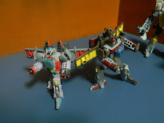 A transformação é interessante: as pernas são compostas por toda a frente do aeroplano, enquanto o ventre e as asas viram ao contrário para formar a cabeça e a mochila. As turbinas formam os braços - com rotores como um "soco inglês". O resultado é um robô muito mais "agressivo" que a outra dupla, mas igualmente posavel.